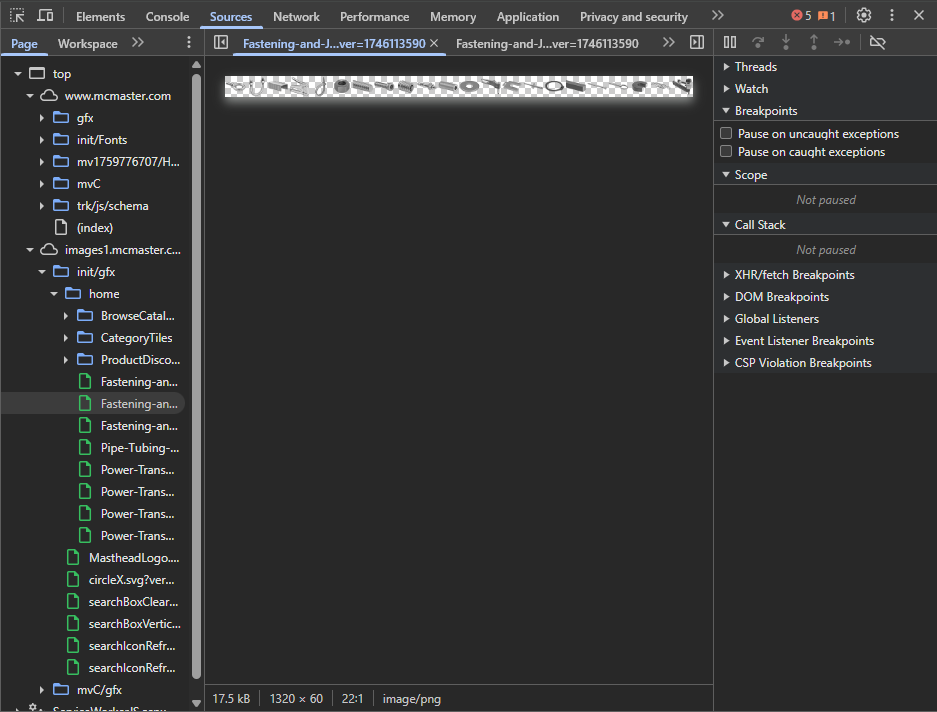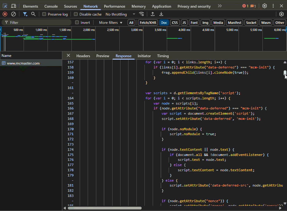 To optimize the resource fetch pipeline, McMaster uses HTML hints like <link rel="preload">, <link rel="preconnect"> (as shown in this previous screenshot), and perhaps DNS prefetches. These let the browser prepare connections or even start resource fetches earlier.