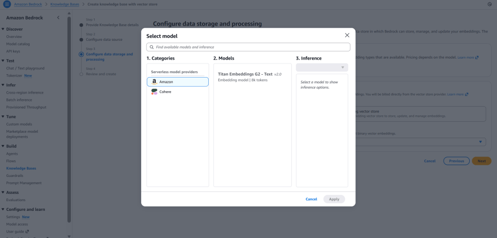 Although there are many models available in Amazon Bedrock, depending on your selected region. But for simplicity we will select Titan Embeddings G2 – Text model from Amazon.