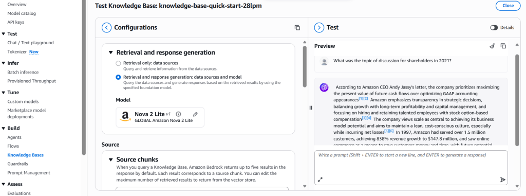 With ingestion completed, we can test retrieval inside the Amazon Bedrock console: