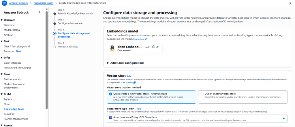 This is the most crucial and complicated step of implementing a RAG in Amazon Bedrock because this step is where things start getting complex.
