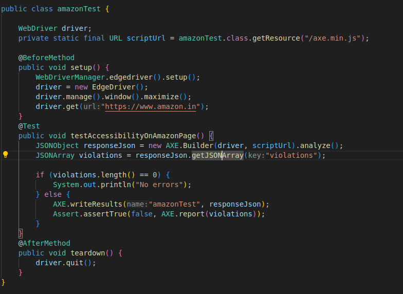 - Now that your environment is set up, let’s write a basic accessibility test script using Java: