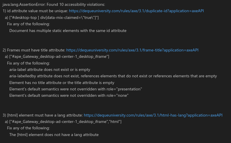 Download “axe.min.js” file from “https://github.com/dequelabs/axe-selenium-java” and place in the “/src/test/resources” directory.
