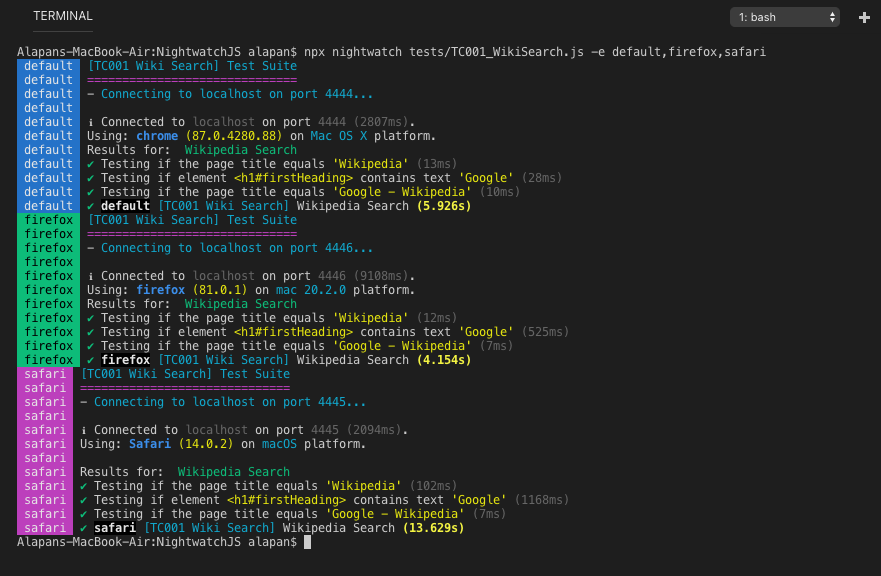 npx nightwatch test/TC001_WikiSearch.js –env default,firefox,safari