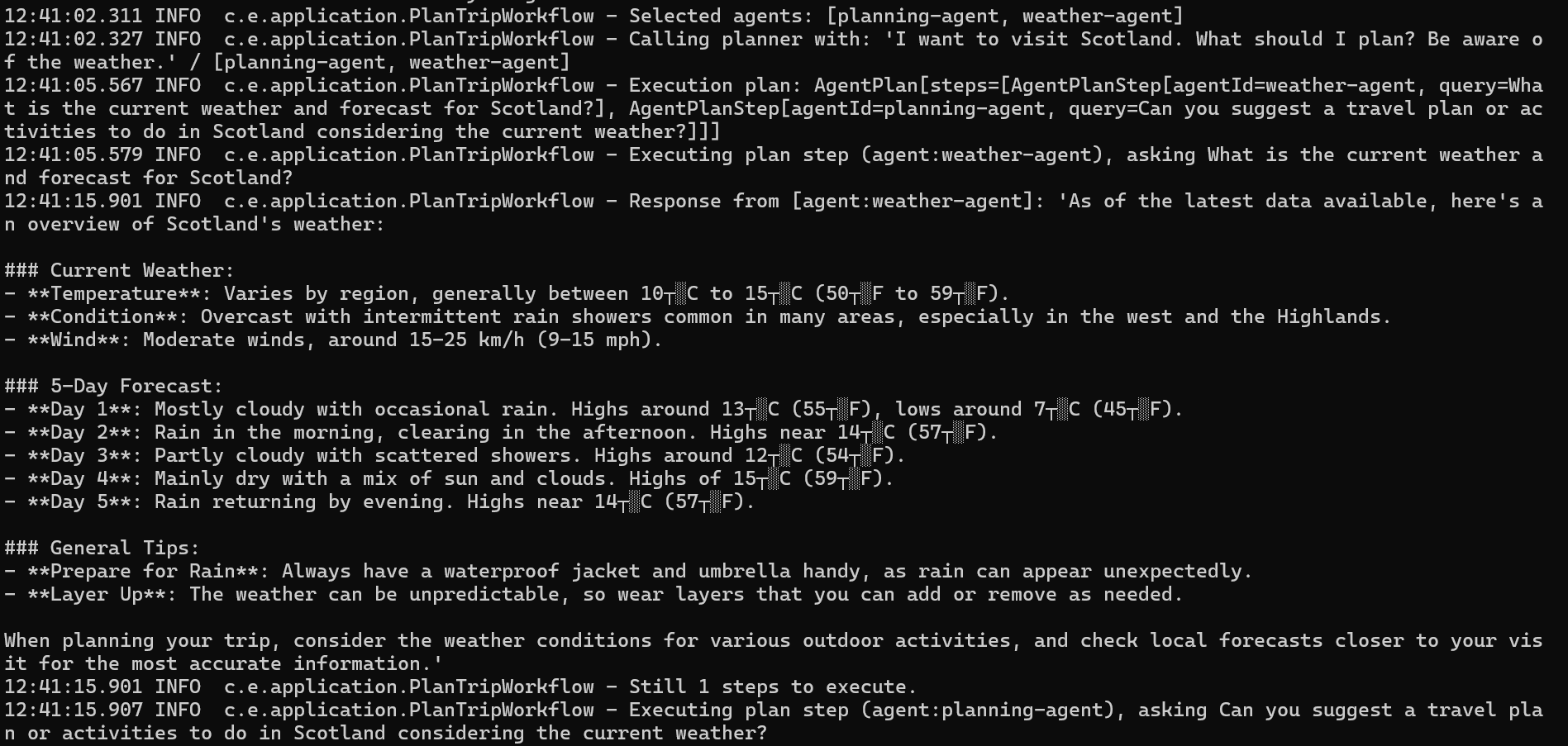 In case you are wondering, the information about the AI agents in the AgentRegistry comes from the @ComponentId and @AgentDescription annotations. Hence, when generating a dynamic plan it becomes important that the agents define those descriptions. So, let’s add required descriptions to Weather & Planning agents.