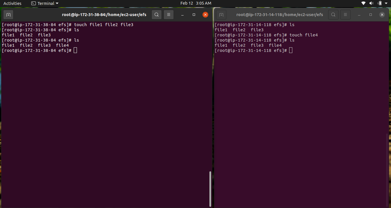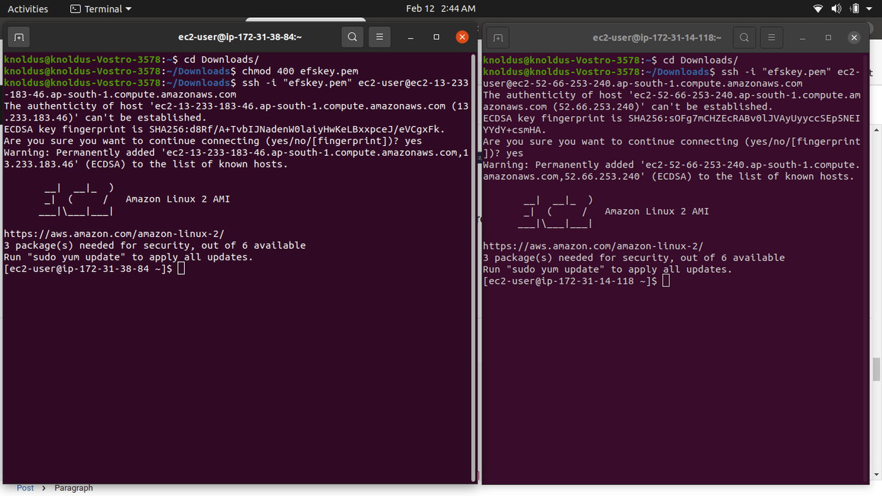 - Create a directory in both the instances using mkdir efs.