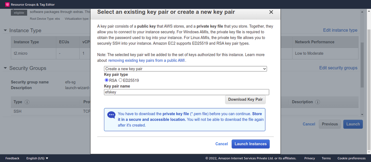 - Create a new key pair and Launch.