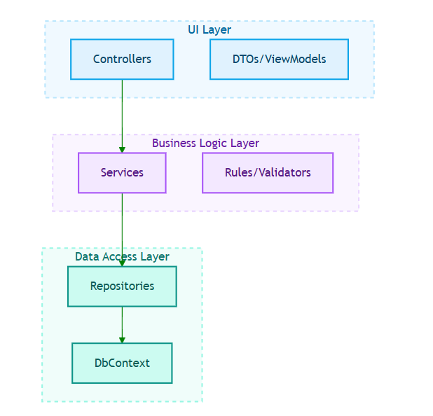The 3-Layer Architecture is a classic and highly adopted structure in enterprise .NET applications. It organizes the system into clear logical layers, ensuring each layer has a single, well-defined responsibility. This helps teams manage complexity as the system grows.