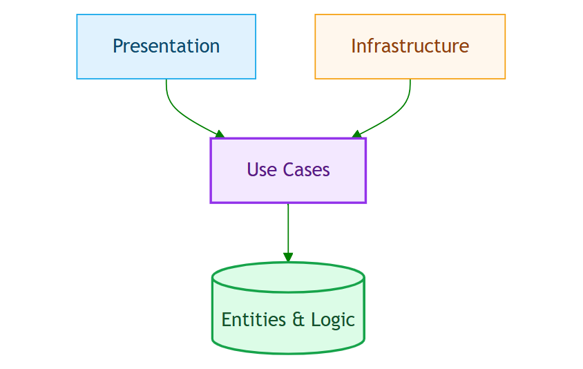 Clean Architecture emphasizes strict separation between the core business logic and everything else. The key principle: