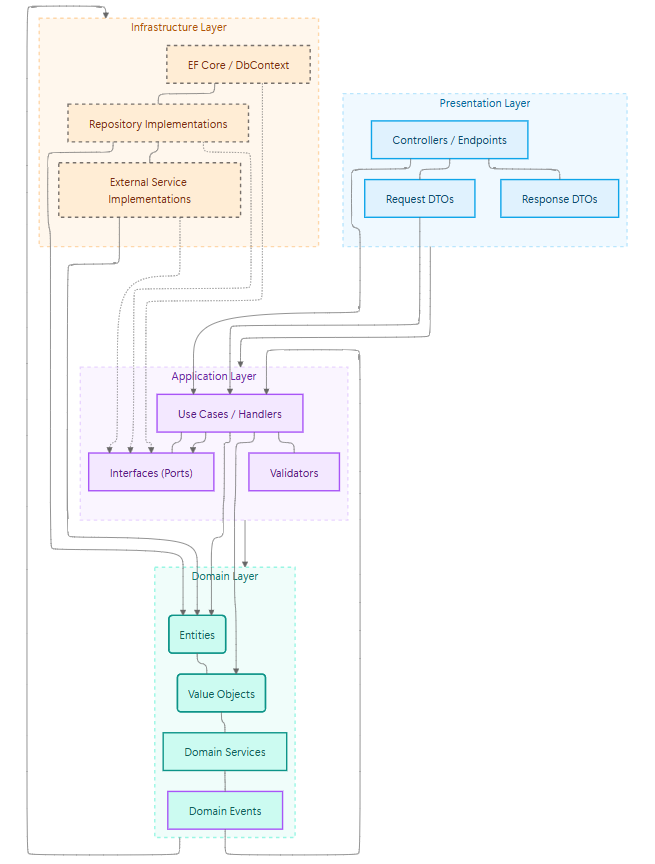 External implementations: EF Core, SQL, external APIs, email services, and file systems. This layer depends on the inner layers via interfaces.