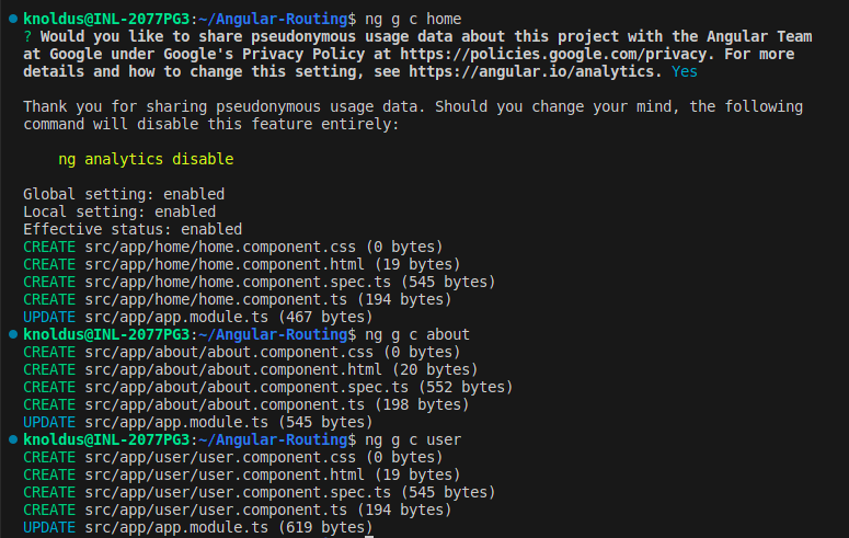These commands will generate three components: HomeComponent, AboutComponent, and UserComponent. You can find these components in the src/app directory.