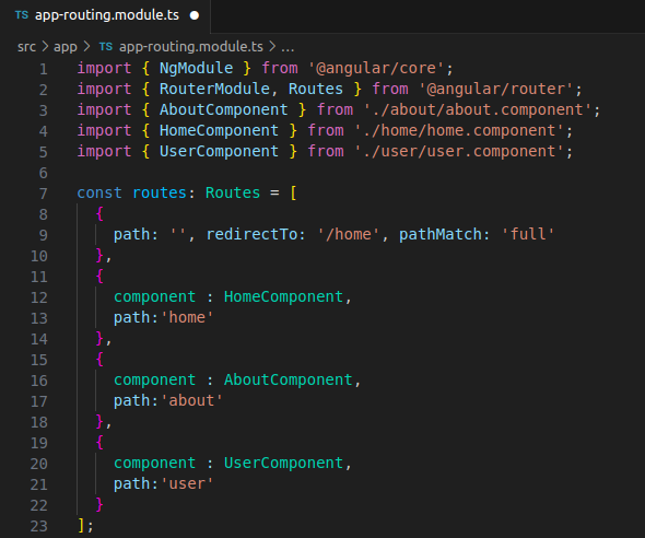 src/app/app-routing.module.tsfile and importRouterModuleandRoutesfrom@angular/router: