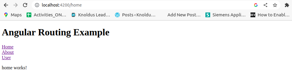 '') redirects to the/homeroute. /homeloads theHomeComponent./aboutloads theAboutComponent./userloads theUserComponent.