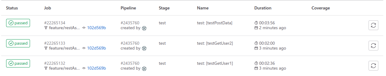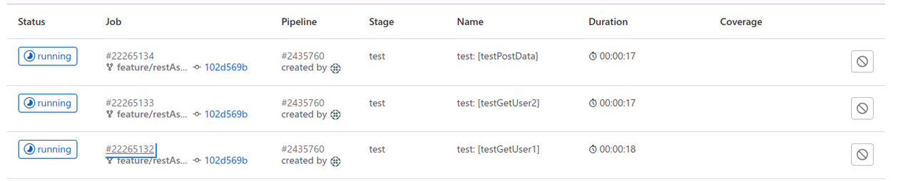 • During the pipeline execution, the test job will run, and the parallel keyword with the matrix configuration will trigger parallel execution of the specified test methods (testGetUser1, testGetUser2, and testPostData).