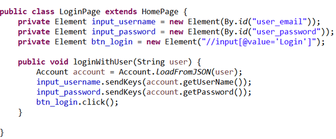 I believe that it’s the most popular design pattern with all automation tester. With this design pattern, all the elements and methods of a page will be stored in a class. The test case will use the page object methods instead of calling the method of the automation tool directly. It will help us to avoid duplicated code in test cases file. Moreover, when we divide the application pages into the page object classes, it’s much easier to maintain or adding new method related to a page. Please see the below picture for example of page object class.