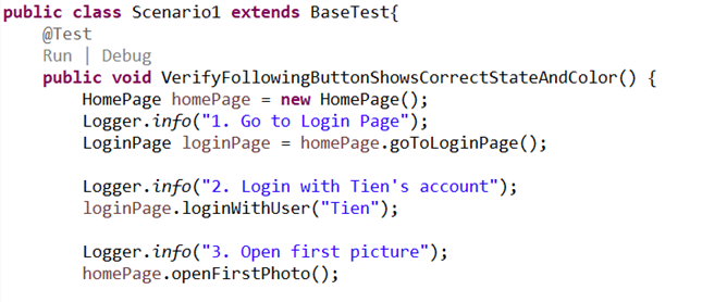 In the test case, we’ll use the page object as below.