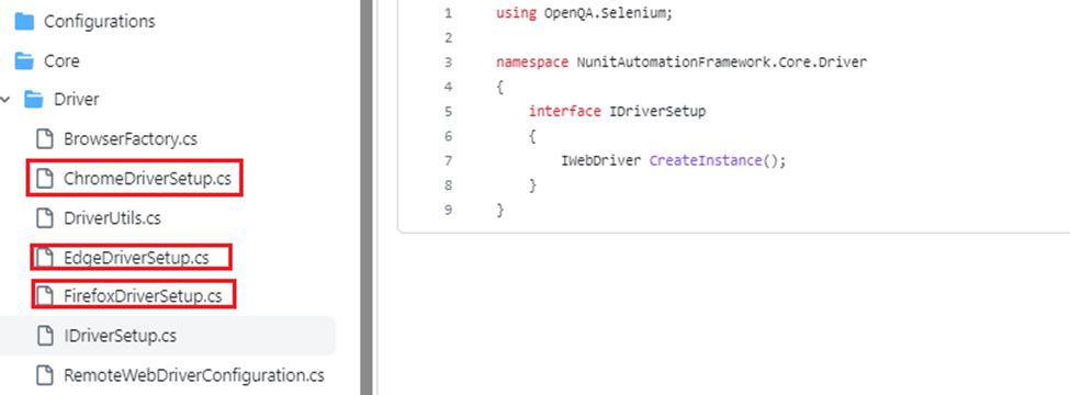Test case will initialize browser through the browser factory. We will define an interface for the browser with a method called CreateInstance. Additionally, we will create several classes, such as Chrome, Firefox, and Edge, which implement the browser interface. Here is the code for the interface.