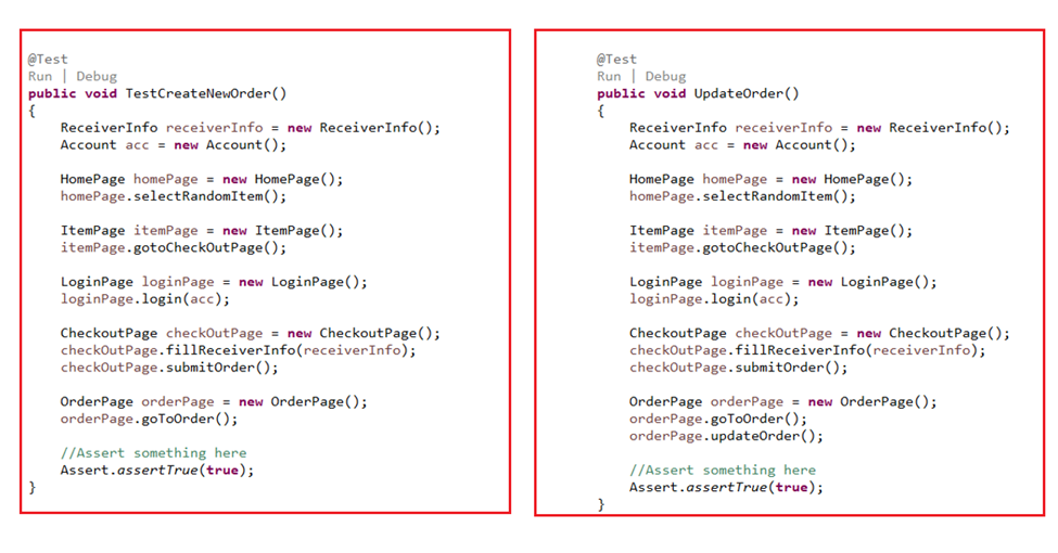 Let’s say we have an e-commerce application, and we have a list of test cases related to order such as creating order, editing order, canceling order…To make sure all the test cases can be run independently, we need the steps to create an order for each test case. The script maybe looks like the below picture.
