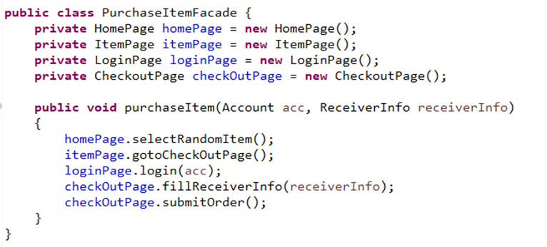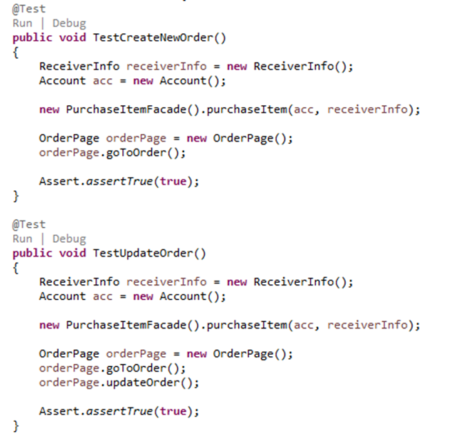 The test cases are now simpler. If there is any change in the creating order flow, we only need to update the function purchaseItem of PurchaseItemFacade class.