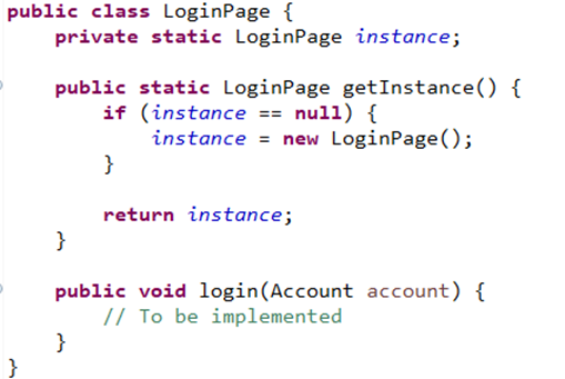If you want to make sure that there is only 1 instance of a class in your project, Singleton can support us to do that. In automation test, we can apply this to manage the instance of page object class. If you’re testing database, we also can use it to make that only 1 connection to the database is establish. To implement this design pattern, in the page object class we can define a static variable and the getInstance method as below.