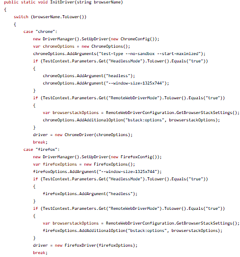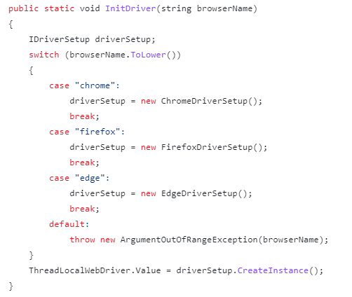 With the implementation of the Factory pattern in the Browser Factory class, the code becomes much simpler, and adding a new kind of browser for testing becomes significantly easier.