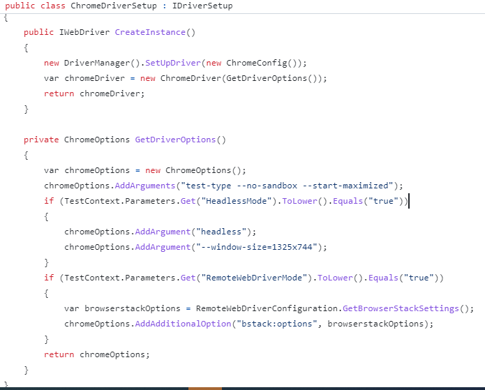 Below is the sample code for the implementation of the IDriverSetUp interface, specifically for ChromeDriverSetup