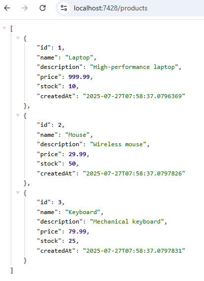 In the ApiService, I’ve created a Minimal API to retrieve all products—just a simple test to verify the SQL Server client integration. Now, let’s call the endpoint to confirm everything is working as expected.