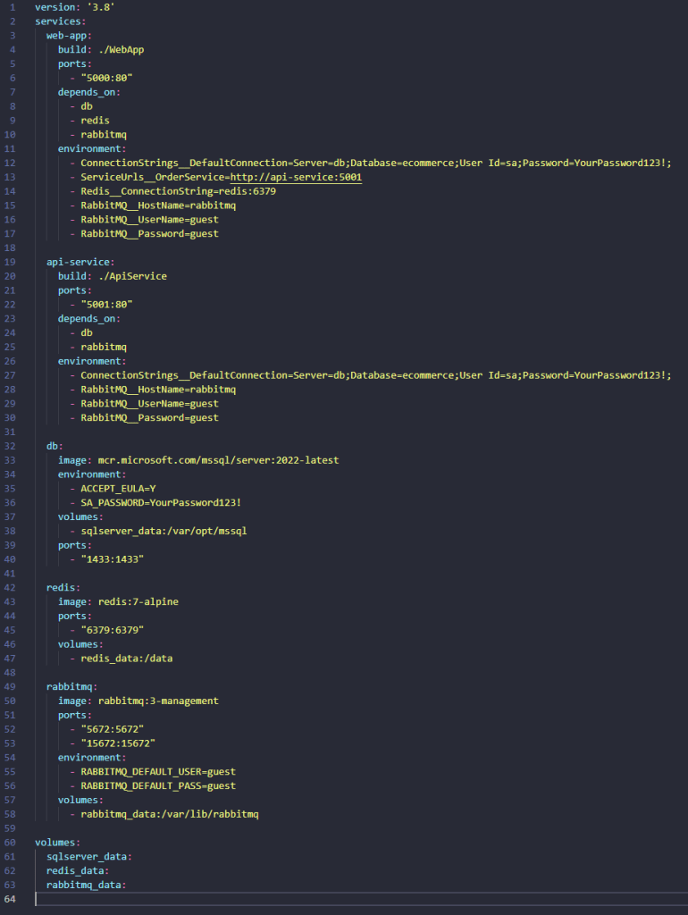Here’s what a typical Docker Compose setup looks like for our e-commerce application: