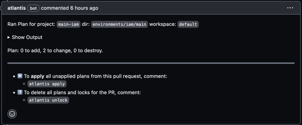 • Once reviewed and approved, trigger apply by commenting: atlantis plan/atlantis apply
