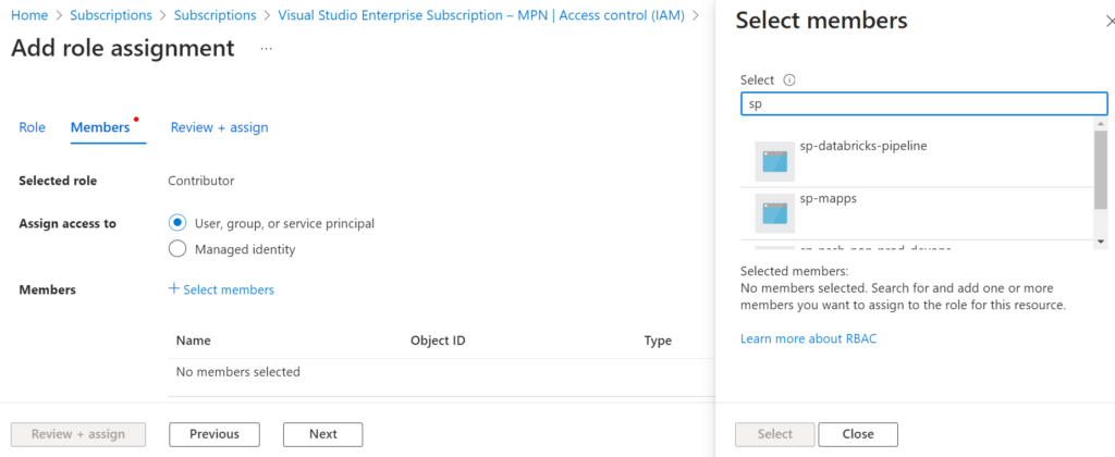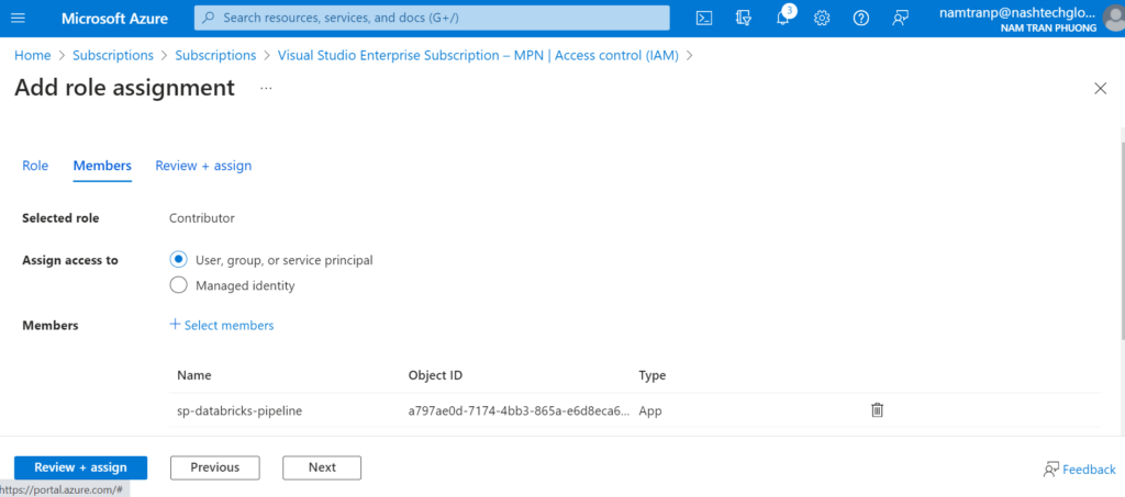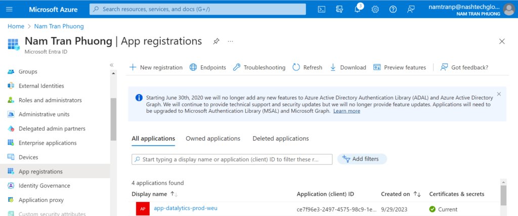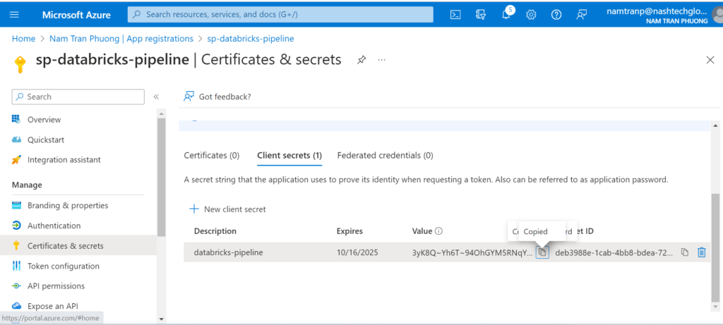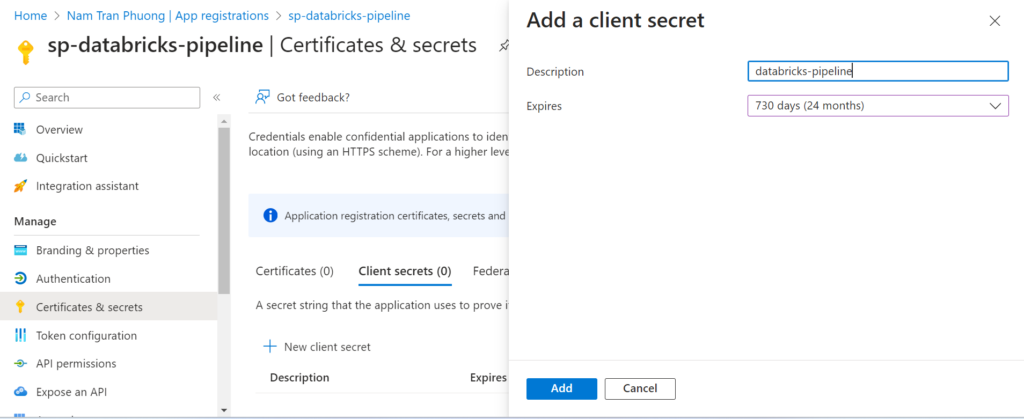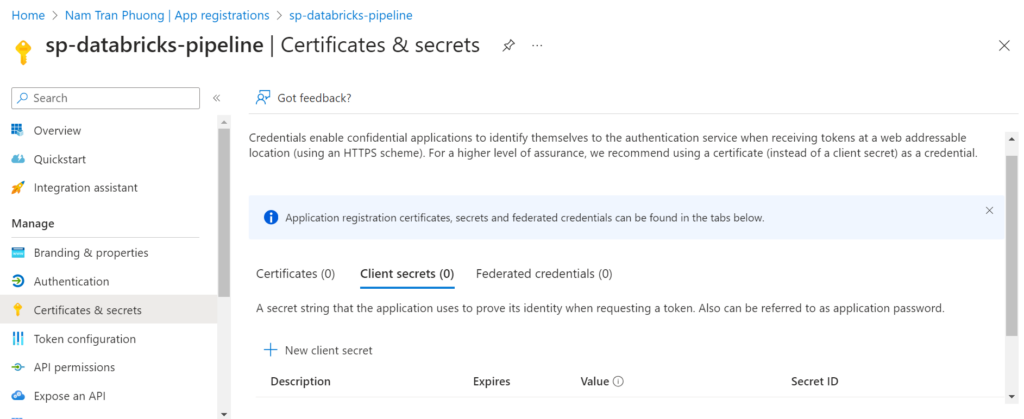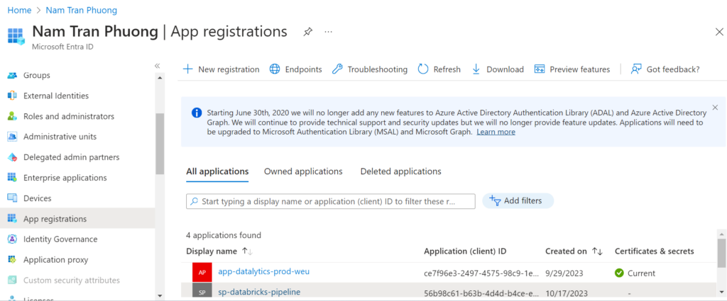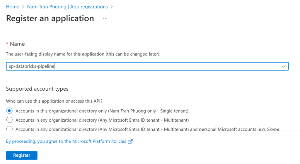 Go to the Microsoft Entra ID, choose the App registrations then create a new app with name: sp-databrick-pipeline