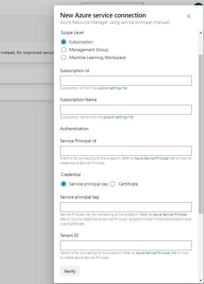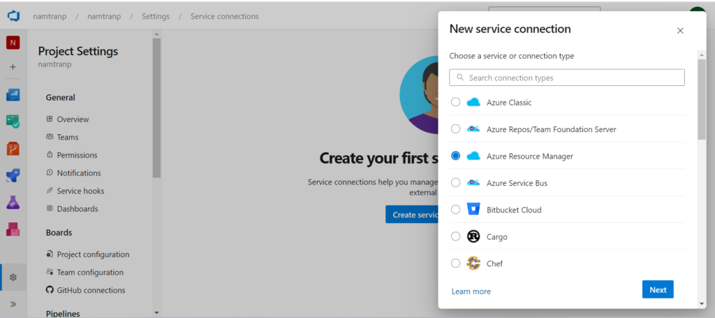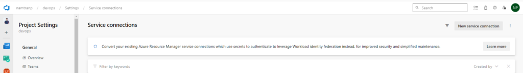 Please be noted that, the service connection name will be used afterward. It will be used in CI/CD YAML files.