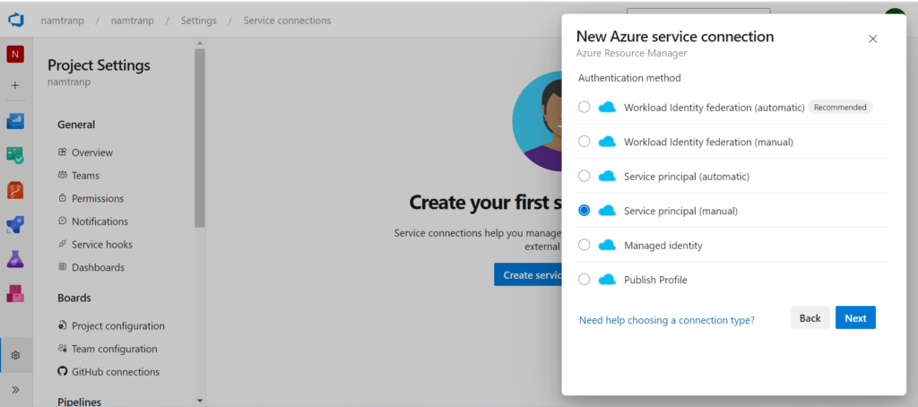 To establish a connection between Azure DevOps and the Azure Portal for Azure resource creation, there are several methods available. In this guide, I’ll demonstrate one of the approaches to configuration.