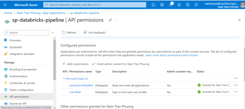 Once we have added the role assignment done, we need to back to the service principle to add more permission. Because it need permission to create the App registrations in the Microsoft Entra ID. Select the sp-databricks-pipeline and choose the API permission then add Application.ReadWrite.All from Microsoft Graph with Delegated permissions.
