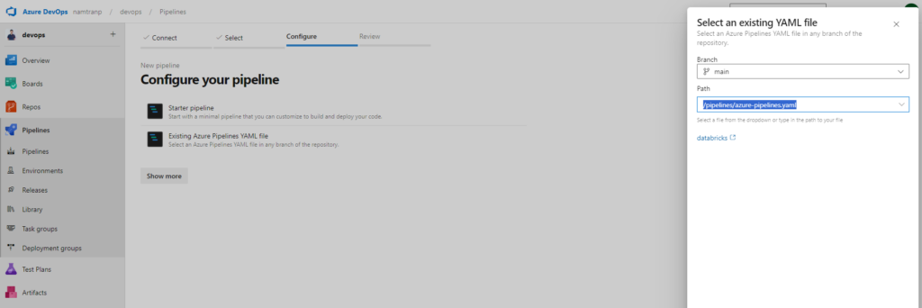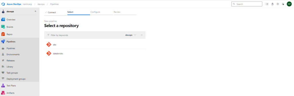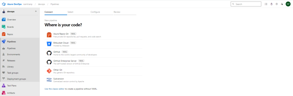 Select the kind of place you store yaml file. For me I use the first one, Azure repos. Once you select that, it required you select the repository and doing configure the pipeline. Here I have already write yaml file as above. So I will choice the option Existing Azure Pipeline YAML file.