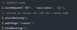 - Be able to implement API Testing with REST or GraphQL. We can leverage API for preparing or cleaning test data for UI test case. This will make the test case more stable and faster. CodeceptJS also support mock request that are used to emulate requests from server by passing prepared data. It also allows users to record all XHR for the endpoint. For example: