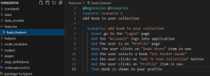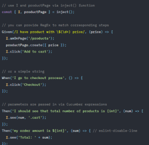 - Step definitions are placed in Typescript file with Given/When/Then functions that map strings from feature files to functions