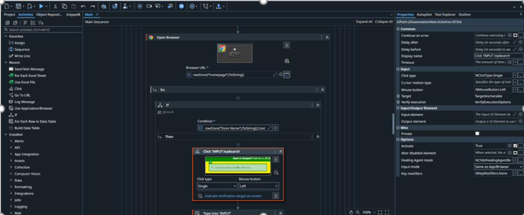 We can simulate user activities using the items in the left column (the Activities panel). To do this, we simply drag and drop activities onto the Sequence section in the center of the screen. In the image above, I am demonstrating how to open a website and search for a product.