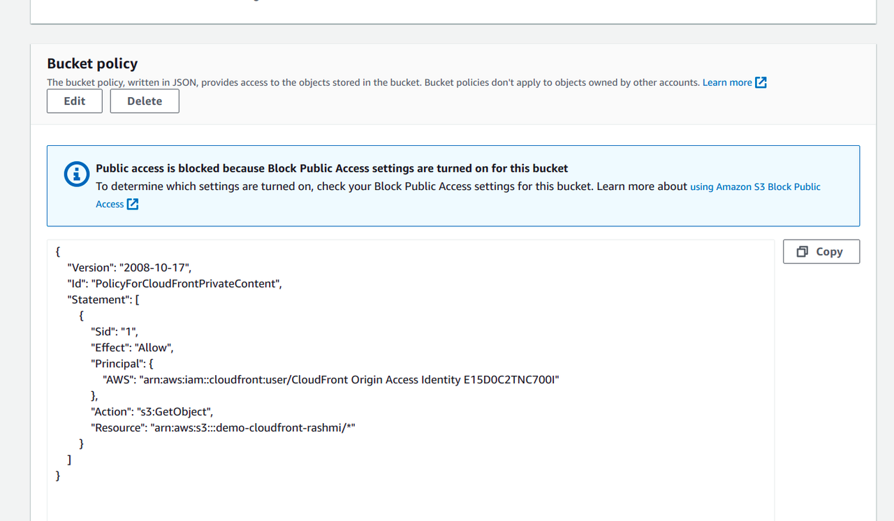 Also if we check our Bucket Policy we are able to find the origin access identity we made and that is connected to our CloudFront distribution and it is allowing us Cloudfront mostly to get the content from the S3 bucket.