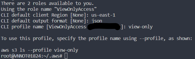 Choose “ViewOnlyAccess” and continue inputting information: client region, default output format, profile name, etc.
