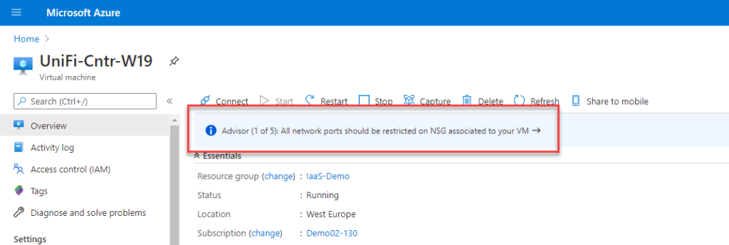 Also, each resource has a similar view as demonstrated with the sample virtual machine below. Azure Advisor and Security Center work together to enhance Security and usability by providing their recommendations.