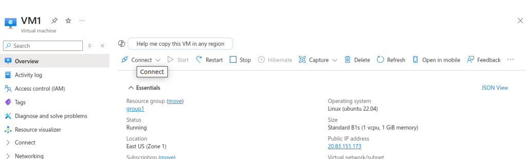 We will SSH into the VM using Azure CLI. Click on configure+connect.