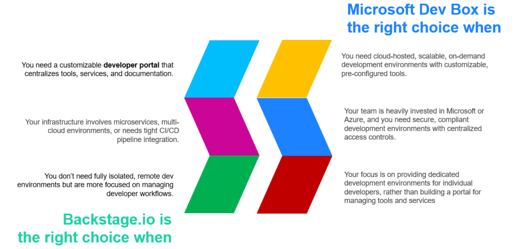 Backstage.io and Microsoft Dev Box serve different, complementary purposes in the DevOps space. Backstage.io excels in organizing and managing internal services, tools, and documentation, enhancing the developer experience and enabling better collaboration. Microsoft Dev Box, on the other hand, provides developers with powerful, on-demand development environments, ideal for teams looking for consistency and scalability without the hassle of managing local setups.