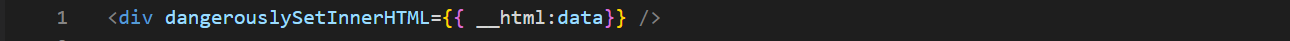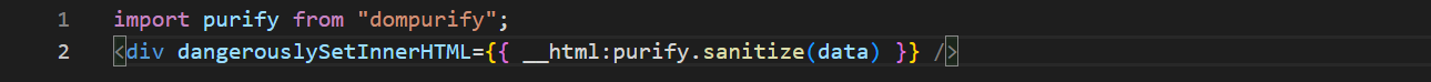 It is possible to insert HTML directly into rendered DOM nodes using dangerouslySetInnerHTML. Any content inserted this way must be sanitized beforehand. Use a sanitization library like dompurify on any values before placing them into the dangerouslySetInnerHTML prop. Use dompurify when inserting HTML into the DOM.