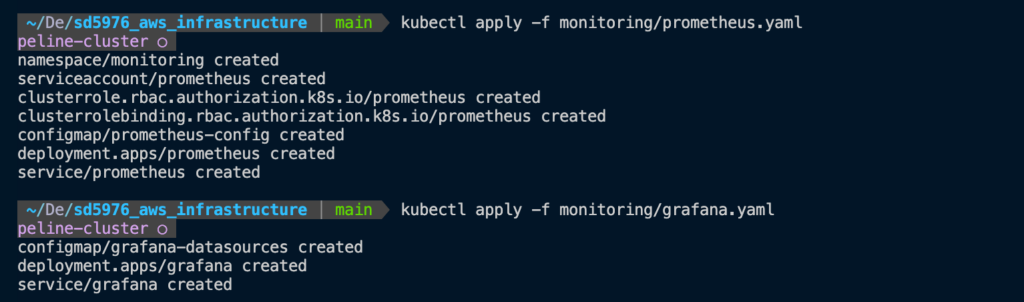 Then, we apply the monitoring manifests from your repository to deploy Prometheus and Grafana: