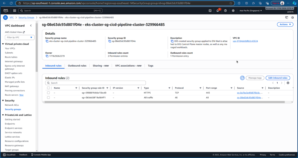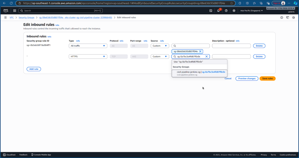 Add an HTTPS inbound rule from Jenkins EC2 instance’s security group cicd-pipeline-jenkins-sg and save the rules.