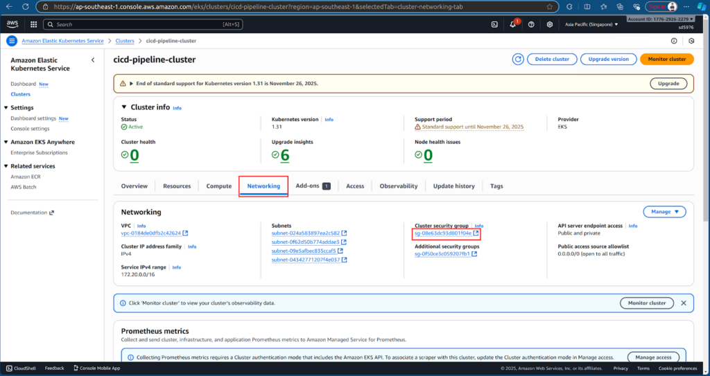 Before Jenkins can deploy to EKS, we need to allow traffic from the Jenkins EC2 instance. Go to cicd-pipeline-clusterNetworking → Click on the security group → Edit Inbound rules.