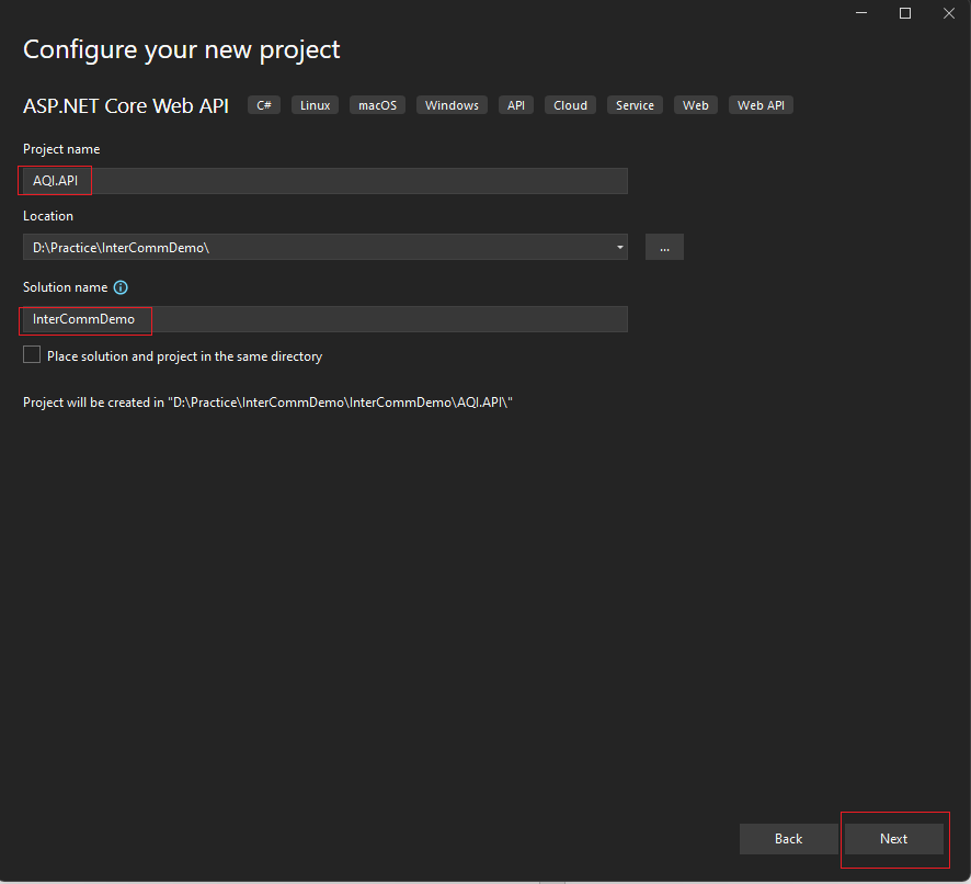In the same solution, Add another “ASP.NET Core Web API” project, name it as “Weather.API” and with the same configuration as we did for the “AQI.API” Project.