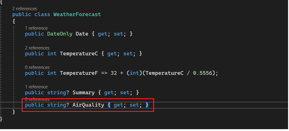 Add a new property WeatherForecast.cs as show below