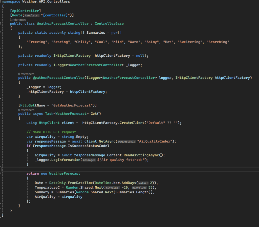 Update the WeatherForecastController in Weather.API project as show. We are using a Named Client pattern to create a HttpClient from the HttpClientFactory.