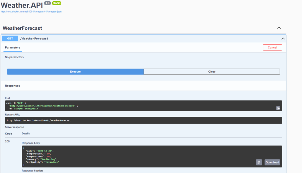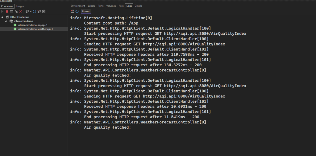 In the first service “aqi.api” we have changed the external port to 8000 which maps to default internal port 8080. In the “weather.api” service we add a new environment variable which stores the address of “aqi.api” container and points to default internal port 8080. As we will do an inter-service communication, so we must specify the internal port instead of external port.