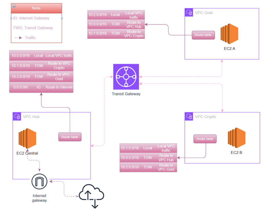 - Spoke VPCs (gold, crypto) → Spokes Route Table